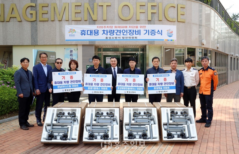홍성소방서 발전위원회(위원장 차대식)는 지난 17일 관내 공동주택 4개소에 지하주차장 화재피해 저감을 위한 ‘휴대용 차량견인장비’를 기증했다.<사진>