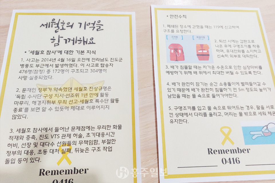 이어 14일에는 홍여울 카페에서 세월호 관련 뱃지 판매부스를 운영했고, 17일 샛별관에서 재판매가 이뤄졌다. 홍성여고 학생회는 수익금을 전액 기부할 예정이라고 전했다.