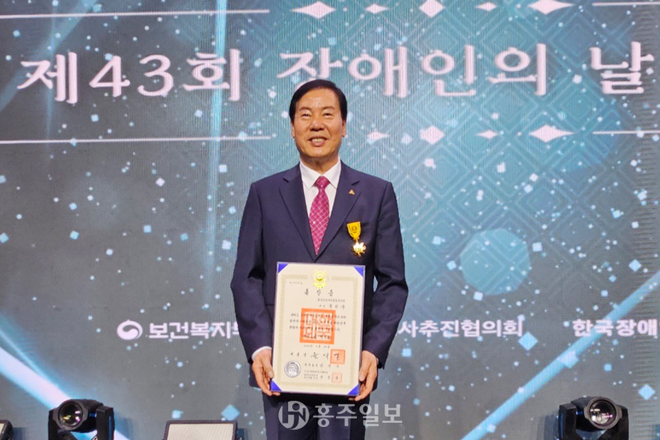 복천규 홍성군장애인종합복지관장이 지난 20일 ‘제43회 장애인의 날’을 맞이해 열린 기념식에서 장애의 역경을 극복하고 장애인 복지증진에 기여한 공로를 인정받아 국민훈장(석류장)을 수상했다.