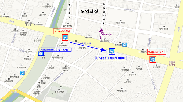 기존 복개주차장 부근 홍성종합양국 앞 승강장과 김좌진장군 동상 오거리 인근 삼성약국 앞 승강장을 철거하고, 홍성전통시장 입구인 LG전자 대리점 앞과 명동상가 입구인 하나빌딩 건너편에 승강장을 신규로 설치한다는 계획이었다.