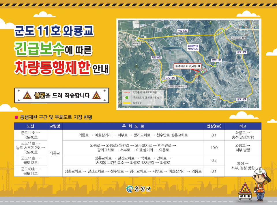 육헌근 군 건설교통과장은 “현재 와룡교 긴급 보수에 따른 차량 통행 제한으로 주민이나 홍성군을 찾는 많은 관광객의 불편 예상이 되지만, 도로 이용자의 생명과 직결되는 사항이기에 우회 도로 사용을 꼭 당부드린다”고 전했다.