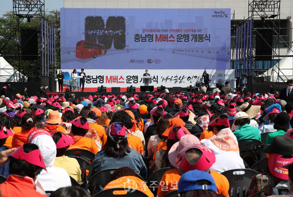 도는 1일 아산 순천향대학교에서 김태흠 지사와 김기서 도의회 건설소방위원회 위원장 등 1000여 명이 참석한 가운데 충남형 M버스 운행 개통식을 개최했다.<사진>