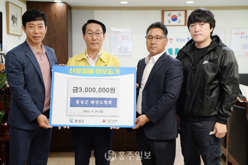 홍성군태권도협회(회장 송이섭)는 지난달 24일 송이섭 회장을 비롯해 장보근 이사, 송명섭 홍성고태권도부 코치와 함께 홍성군청 군수실을 방문해 지난달 2일부터 사흘간 발생한 홍성 산불피해 이재민을 위해 사용해달라며 성금 300만 원을 이용록 군수에게 전달했다.