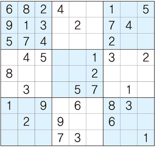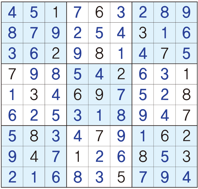 3. 큰 정사각형(9x9) 안에 있는 작은 정사각형(3x3) 안에는 숫자 1~9가 각 한 번씩 들어간다.