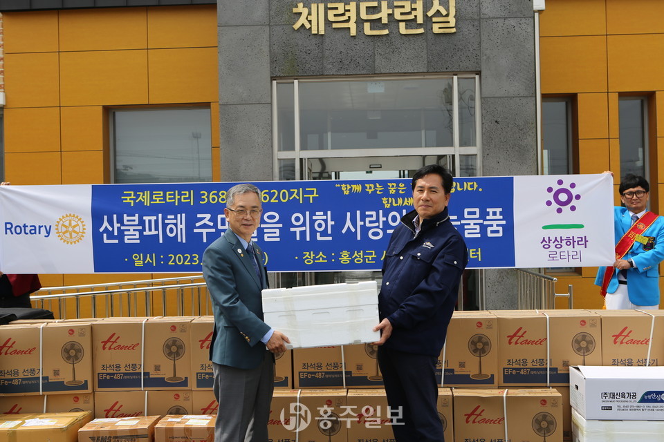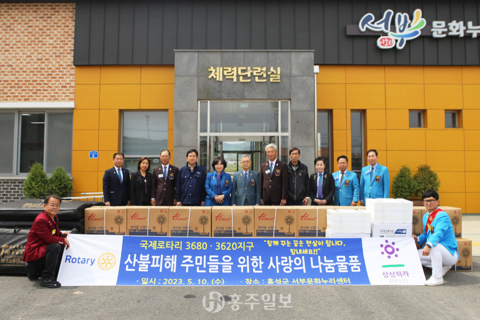 국제로타리 3680지구(이종림 총재)와 3620지구(이서영 총재)는 지난 10일 서부면 이재민 임시대피소를 찾아 홍성 산불피해 주민을 위한 물품을 전달했다.<사진>