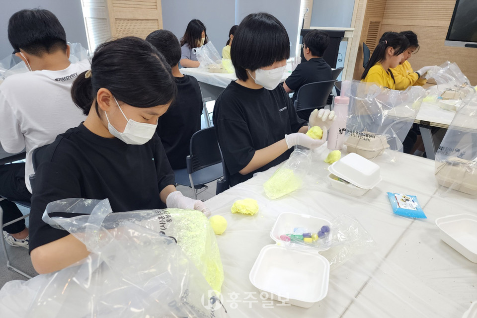 친환경 제품만들기 체험프로그램으로 코코넛이용 친환경 비누만들기, 아이스팩 재활용을 통한 디퓨저만들기, 과자로 텃밭케익 만들기를 체험했다.
