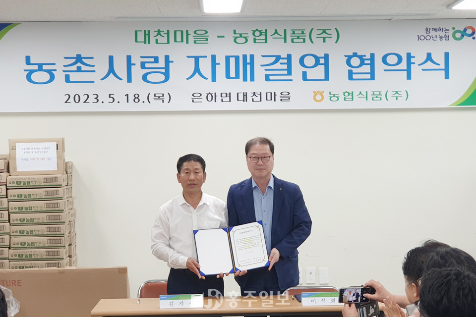 은하면 대천마을(이장 김지세)은 지난 18일 대천마을 영농회원, 광천농협 조합장·직원, 농협중앙회 홍성군지부장·단장, 은하면장 등 100여 명이 참석한 가운데 농협식품㈜(대표 이석희)와 ‘농촌사랑 자매결연’을 맺고 ‘명예이장 위촉식’을 가졌다.<사진>