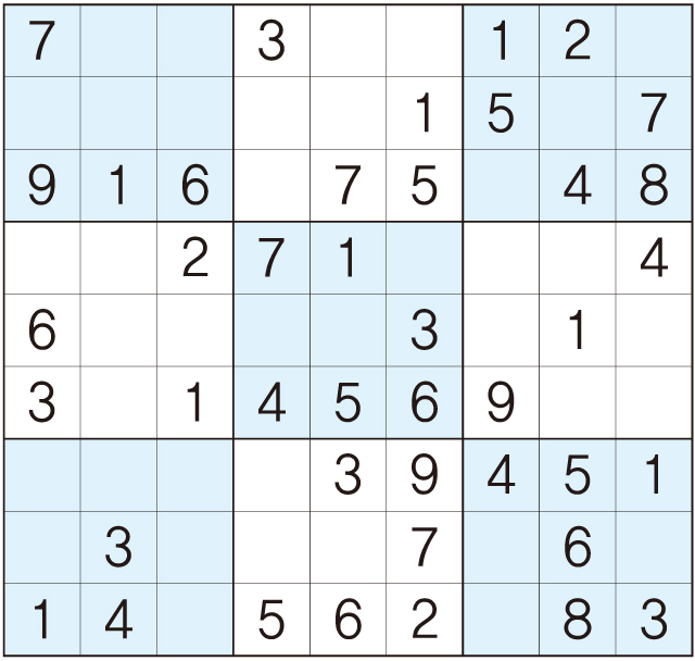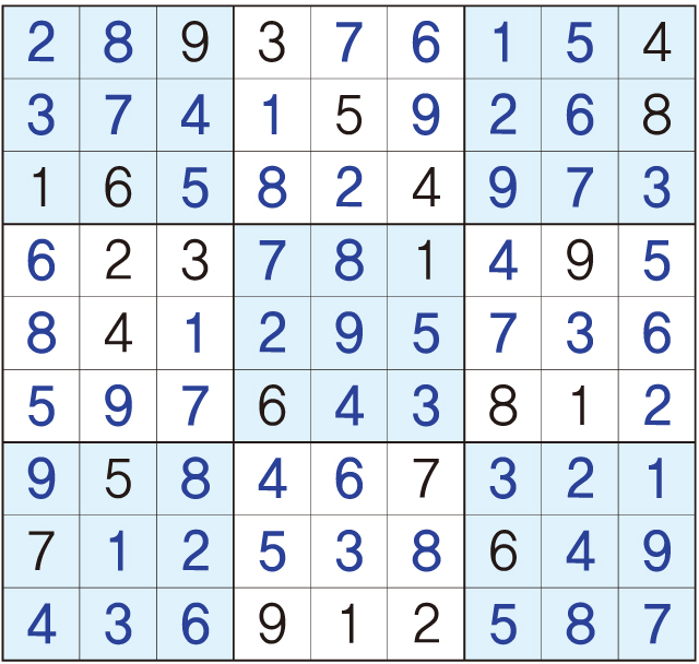 3. 큰 정사각형(9x9) 안에 있는 작은 정사각형(3x3) 안에는 숫자 1~9가 각 한 번씩 들어간다.