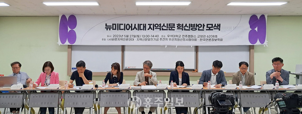 한국언론정보학회가 주최하고 ㈔바른지역언론연대와 지역신문발전기금 주간지 우선지원 선정사협의회가 후원한 ‘2023 한국언론정보학회 봄철 정기학술대회’ 속 ‘뉴미디어시대, 지역신문 혁신 방안 모색’ 토론회가 지난 27일 우석대학교 전주 캠퍼스 교양관에서 열렸다.
