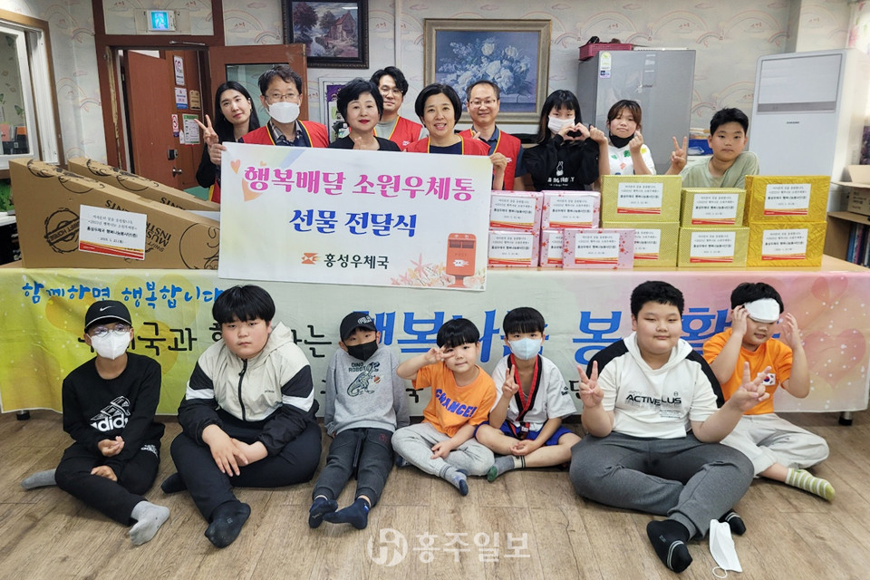홍성우체국(국장 김미숙)은 지난 22일 가정의 달을 맞아 홍주천년지역아동센터(센터장 김태자)를 찾아 ‘행복배달 소원우체통’ 행사를 가졌다.<사진>