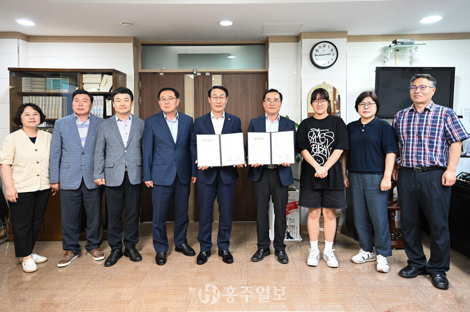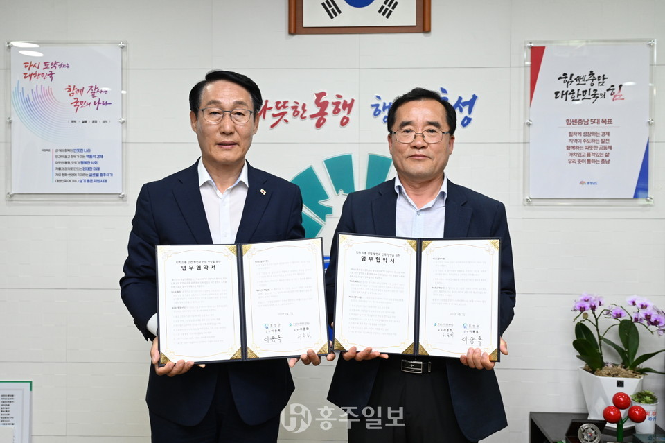 홍성군이 충남드론항공고등학교와 함께 지역 드론 산업 발전과 드론 관련 인재양성을 위한 업무협약을 체결했다.<사진>