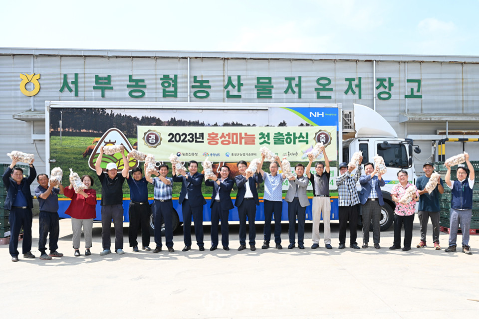 홍성군의 대표 지역특화작물 홍성마늘이 지난 15일 서부농협 공동 선별장에서 2023년산 홍성마늘 출하식을 개최하고 본격적인 출하 시작을 알렸다.<사진>