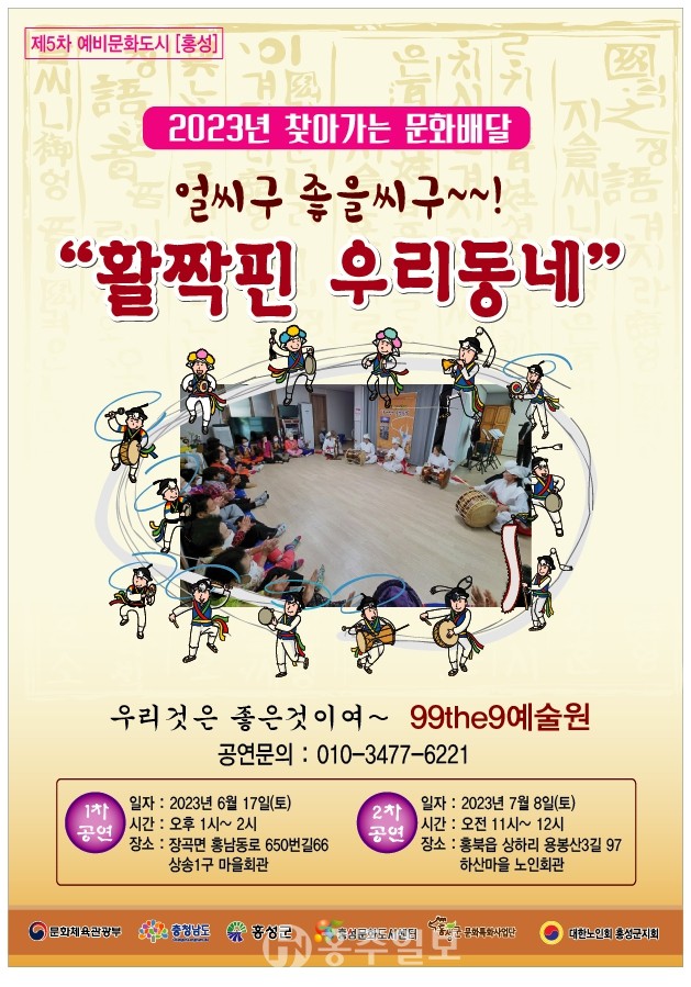 홍성문화도시센터의 ‘2023년 찾아가는 문화배달’ 지원사업에 선정된 99the9예술원의 ‘얼씨구 좋을씨구! 활짝 핀 우리동네’ 공연이 오는 17일 오후 1시에 장곡면 상송 1구 마을회관에서 개최된다.