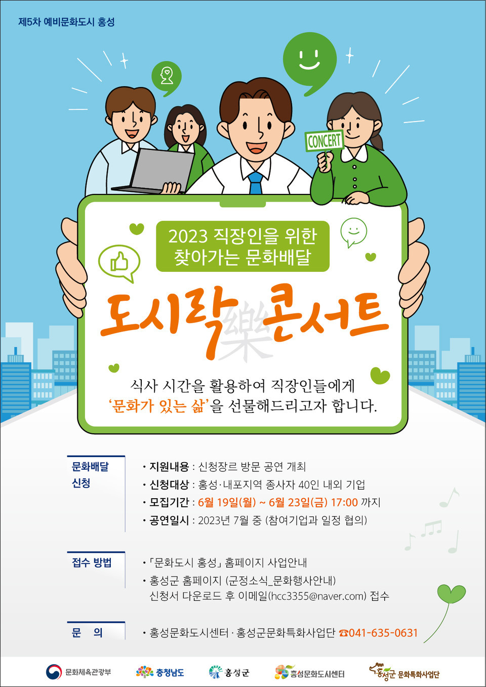 홍성문화도시센터가 점심시간을 활용한 문화예술공연의 ‘직장인을 위한 찾아가는 문화배달 : 도시락(樂) 콘서트’ 참여기업을 신청받는다.<사진>