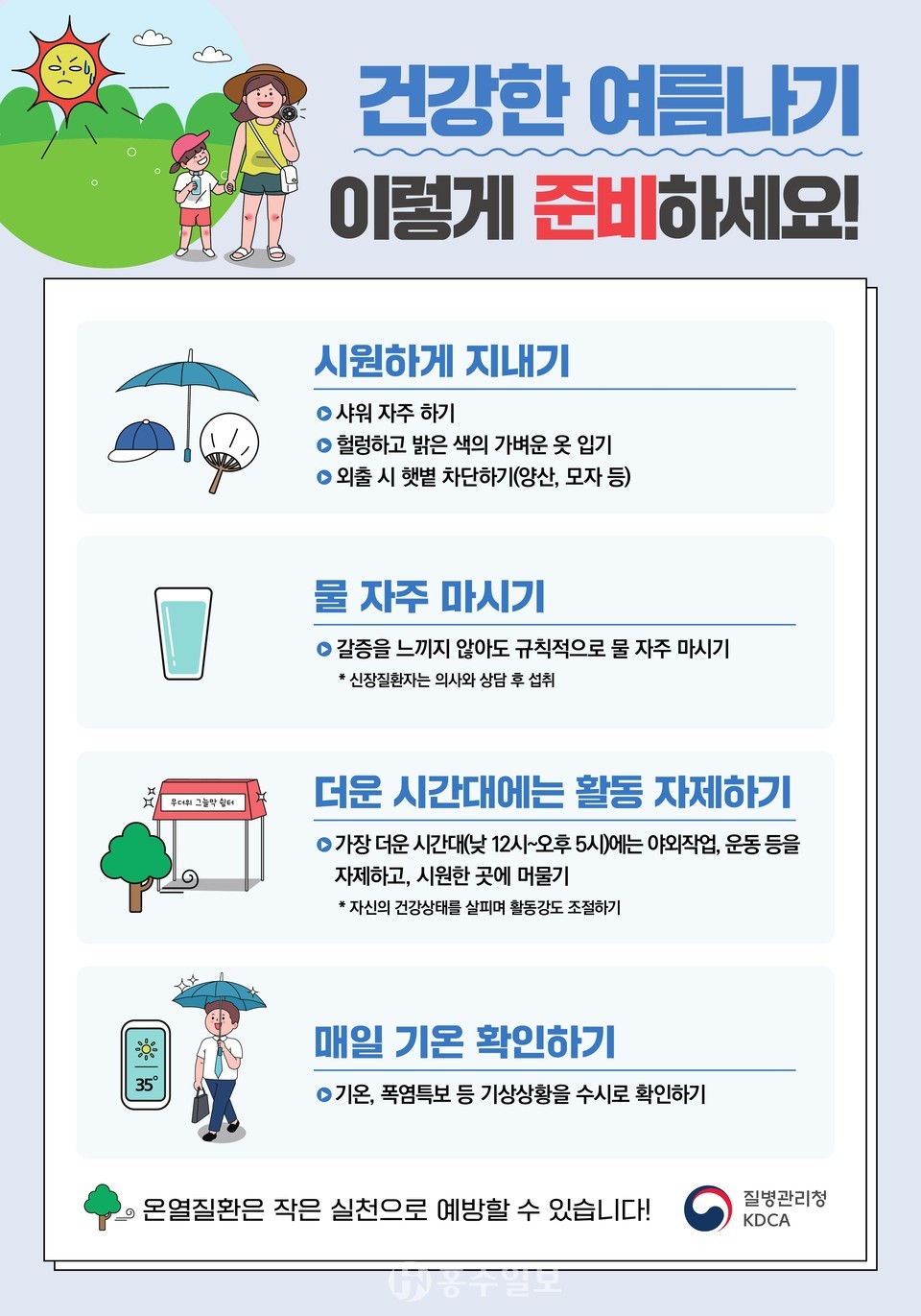 온열질환을 예방하기 위해서는 ‘시원하게 지내기, 물 자주 마시기, 더운 시간대에는 활동 자제하기’ 등 생활 속 작은 실천으로 폭염 대비 건강 수칙을 준수하는 것이 중요하다.