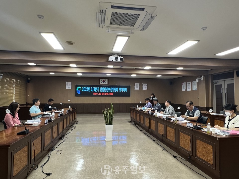 홍성군은 지난 16일 군청 회의실에서 산업안전보건위원회 사용자위원과 근로자위원이 참석한 가운데 군 소속 현업근로자의 산업재해 예방과 보건증진을 위한 ‘2023년 2분기 산업안전보건위원회 정기회의’를 개최했다.<사진>