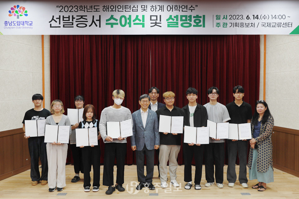 충남도립대는 지난 14일 대학 도서관 소강당에서 하계 어학연수생 8명과 해외인턴십 2명에 대한 선발증서 수여 및 설명회를 개최했다. 하계 어학연수는 해외 인턴십 또는 복수학위제 학생들의 어학실력과 현지 적응 능력 향상을 위한 프로그램이다.<사진>