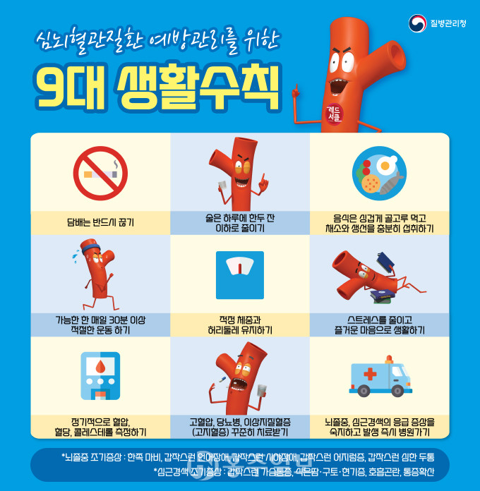 심뇌혈관질환 예방·관리를 위해서는 먼저 자신의 혈압, 혈당, 콜레스테롤 수치를 정기적으로 확인하는 것이 중요하며, 이를 통해 심뇌혈관질환으로 인한 조기사망의 80%를 예방할 수 있다.