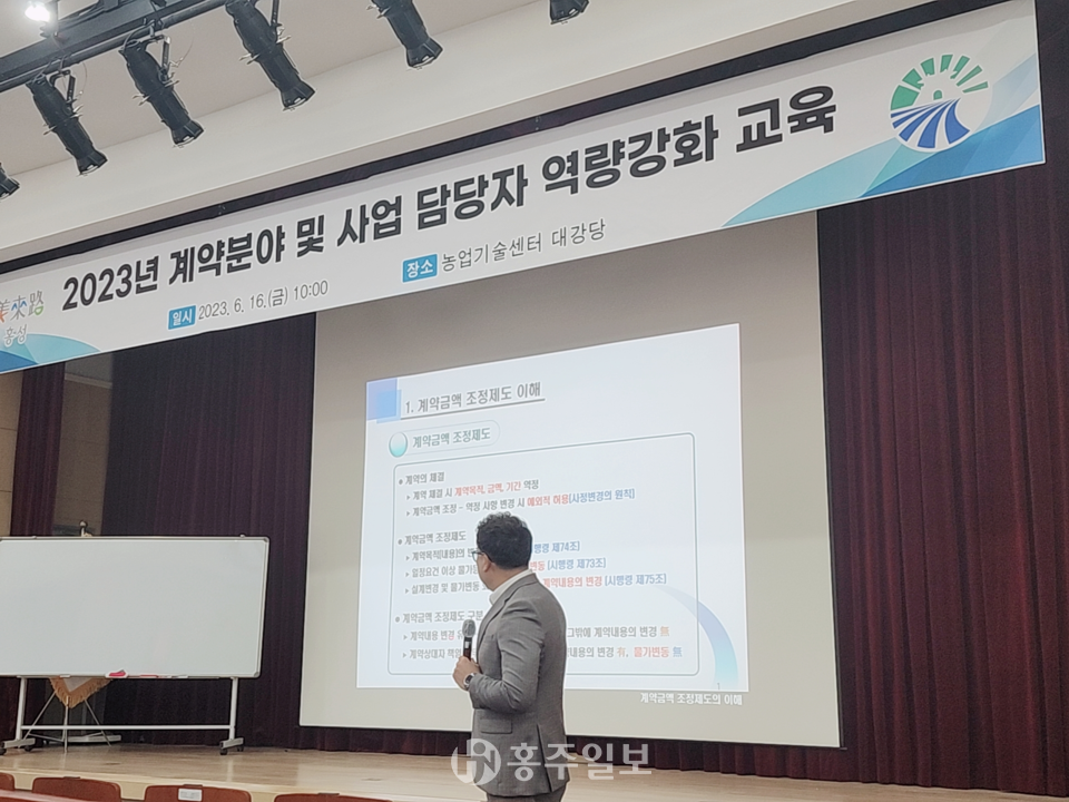 홍성군은 공공계약 분야의 전문성과 투명성 강화를 위해 지난 16일 홍성군농업기술센터 대강당에서 계약분야 및 사업 담당자 50명을 대상으로 역량강화 교육을 실시했다고 밝혔다.<사진>