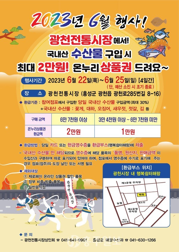 행사는 오는 6월 22일(목)부터 25일(일)까지 4일간 광천전통시장에서 시행되며, 행사참여점포(74개소)에서 당일 국내산 수산물을 구입하면 최대 30%(1인 2만 원 한도)까지 온누리상품권으로 환급해주는 방식으로 진행된다.
