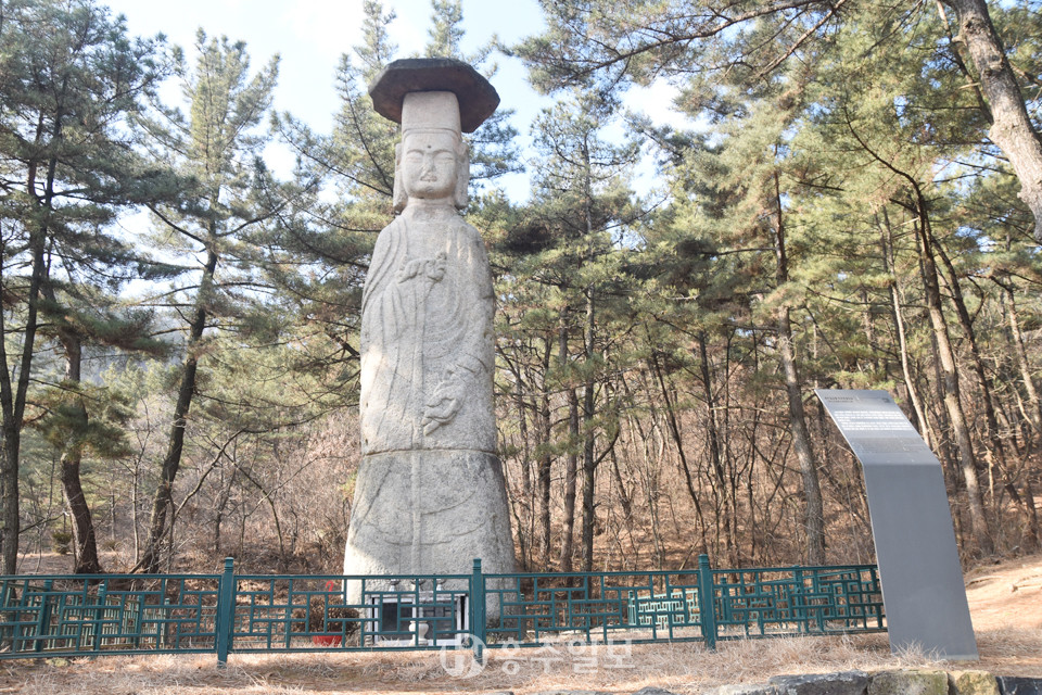 머리에는 두건 같은 관(冠)을 쓰고 있고, 그 위에 6각으로 된 갓 모양의 넓적한 돌을 올려놓았다. 어깨의 윤곽은 아래로 내려가면서 조금씩 넓어지지만 양감이 전혀 없이 밋밋해 마치 돌기둥 같다. 왼손은 몸에 붙인 채 아래로 내리고 있고, 오른손은 가슴까지 올려 돌지팡이 같은 것을 잡고 있는데, 양발 사이까지 길게 내려오고 있다. 거구이면서 볼륨이 없는 돌기둥 형태, 간략한 신체표현 방법 등이 논산 관촉사 석조미륵보살입상, 부여 대조사 석조미륵보살입상과 유사한 양식을 가진 지방적인 특징이 보이는 고려 시대의 작품이다”라고 기록하고 있다.