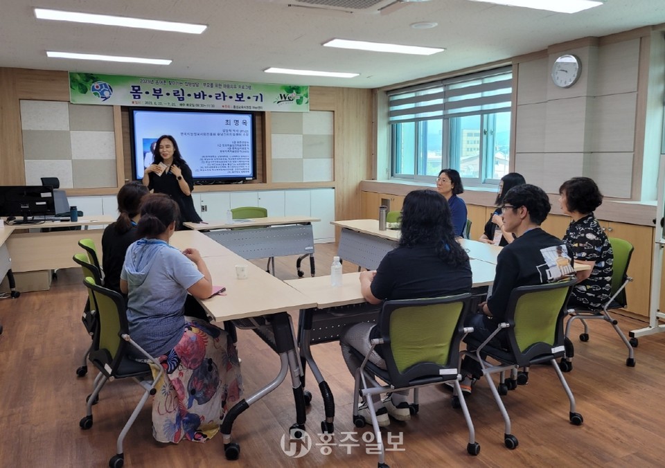 충청남도홍성교육지원청(교육장 이정순) Wee센터는 22일 홍성교육지원센터 2층 나래둥지에서 학부모 10명이 참석한 가운데 농어촌 찾아가는 집단상담의 일환으로 학부모 마음치유 프로그램(몸부림 바라보기)을 진행했다.<사진>