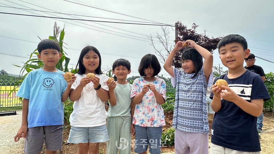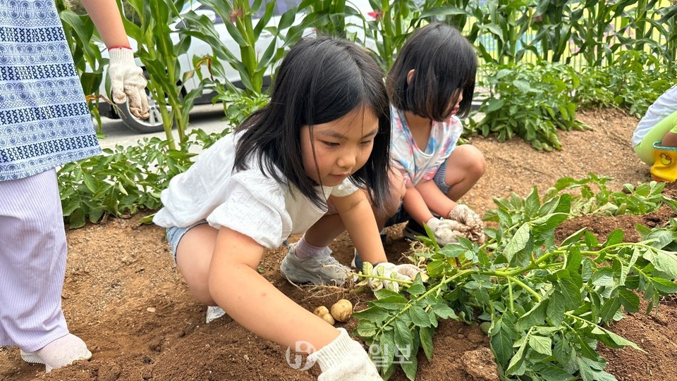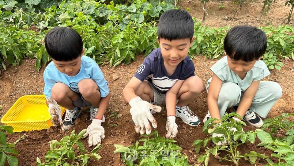 원아들과 학생들은 지난 3월 20일에 심었던 감자가 얼마나 열렸을지 궁금해하며 장갑을 끼고 한 손에 호미를 들고 학교 텃밭에 모였다. 그동안 감자에 싹이 트고 줄기가 길어지고 잎과 꽃이 활짝 피는 모습을 지켜보았기에 큰 감자를 캘 수 있을 거라는 기대심도 가득했다.