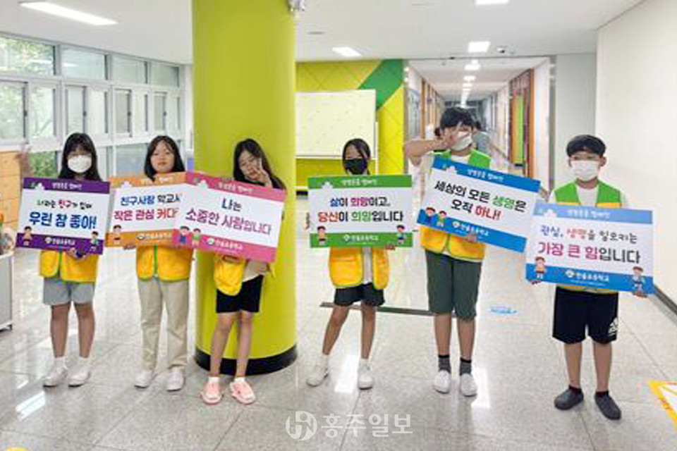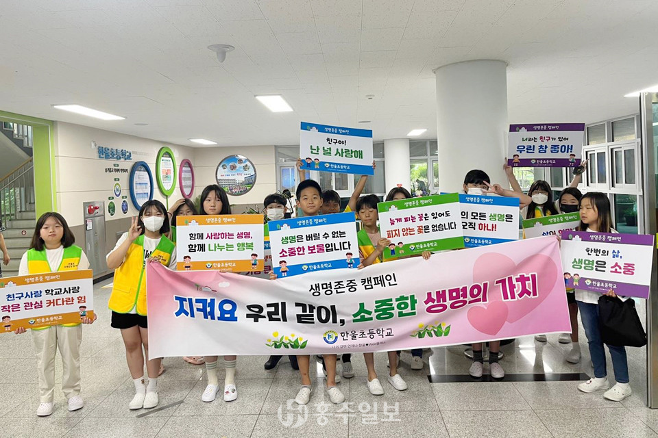 한울초등학교(교장 조국현)는 지난 29일에 우리 모두가 소중한 존재임을 알리기 위해 1~6학년 학생을 대상으로 등굣길 생명존중 캠페인을 실시했다.<사진>