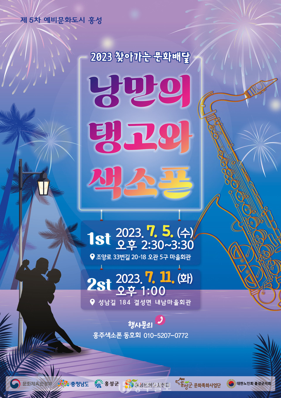 홍성문화도시센터의 2023년 ‘찾아가는 문화배달’ 지원사업에 선정된 홍주색소폰동호회의 ‘낭만의 탱고와 색소폰’공연이 오는 5일 오후 2시 30분에 홍성읍 오관 5구 마을회관(1차), 11일 오후 1시(2차)에 내남마을회관에서 개최된다.<사진>