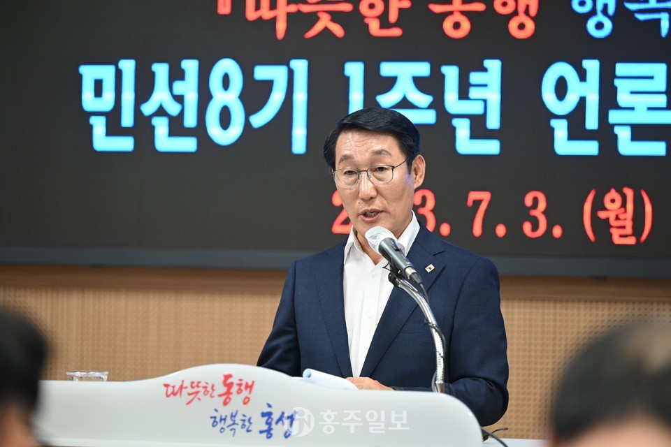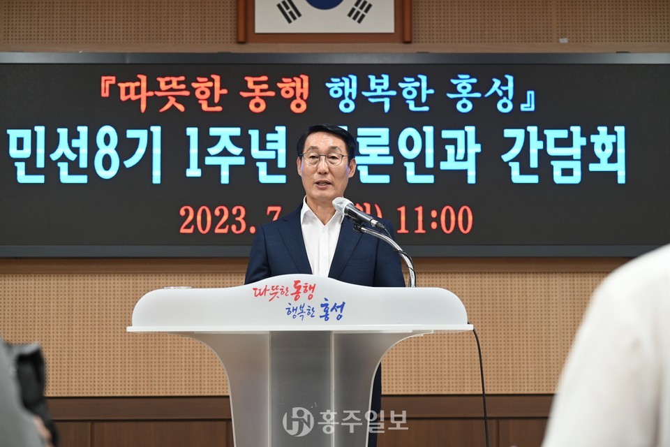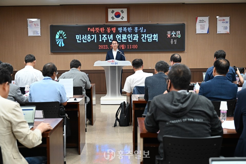 이용록 홍성군수는 지난 3일 군청 회의실에서 민선 8기 1주년 언론인 간담회를 갖고 그동안의 성과와 앞으로의 군정 운영 등에 대한 청사진을 밝혔다.<사진>