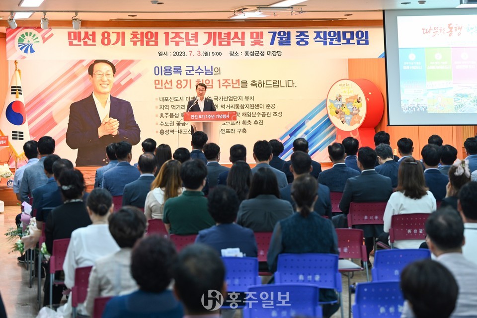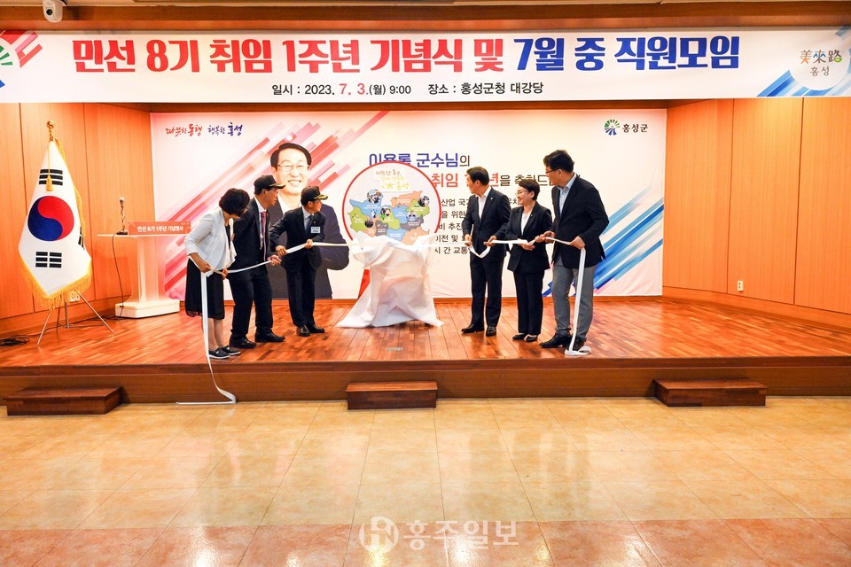 민선 8기 홍성 군정 키워드는 ‘동행과 행복’으로 식전 축하 공연, 유공자 시상, 1주년 발자취 영상 시청, 기념 선물 전달 등으로 약소하면서도 군정 비전을 담아 내실 있는 행사로 진행됐다.