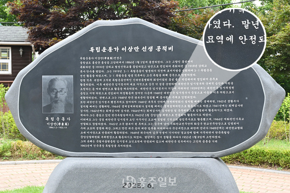 ‘이상만 선생 공적비’에 적힌 내용을 유심히 살펴본 결과, 본문 말미에 “그의 유해는 국립서울현충원 임시정부 요인묘역에 ‘안정’되어 있으며”라며 ‘안장(安葬)’을 ‘안정’으로 잘못 새긴 것이 확인됐다.