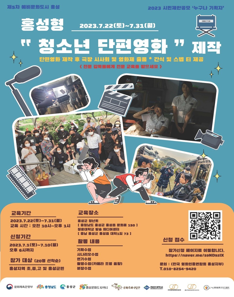 홍성형 청소년 단편영화 제작은 영화에 관심 있는 홍성 지역민에게 영화 예술에 대한 진로 체험의 기회와 문화 가치 인식의 기회 제공을 목표로 하며 기획, 시나리오, 연기, 촬영(카메라·조명·음향), 분장에 대한 이해와 실습으로 영화를 제작한다.