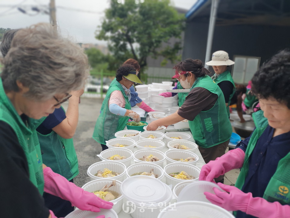 초복을 앞두고 지난 5일 홍동면에서는 33개 마을의 새마을부녀회장들이 합심하여 지속되는 폭염과 폭우로 몸과 마음이 지친 이웃들에 따뜻한 손길을 내미는 삼계탕 나눔행사를 진행했다.<사진>