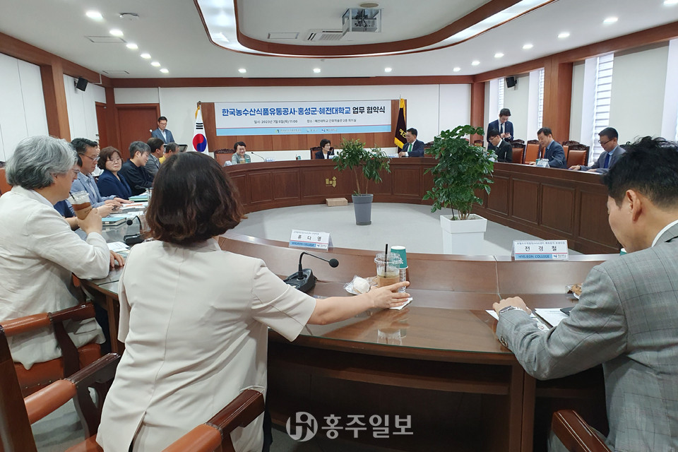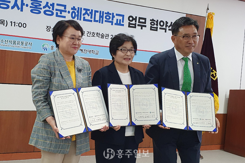 한국농수산식품유통공사(사장 김춘진), 홍성군(군수 이용록), 혜전대학교(총장 이혜숙)는 저탄소 식생활 실천과 6차산업과 청년 농어업인 육성·지역 농산물 수출활성화를 도모해 지역경제 활성화·지속 가능한 먹거리 가치 실천 확대를 위해 6일 혜전대학교 간호학술관 2층 양해각서(MOU)를 체결했다.