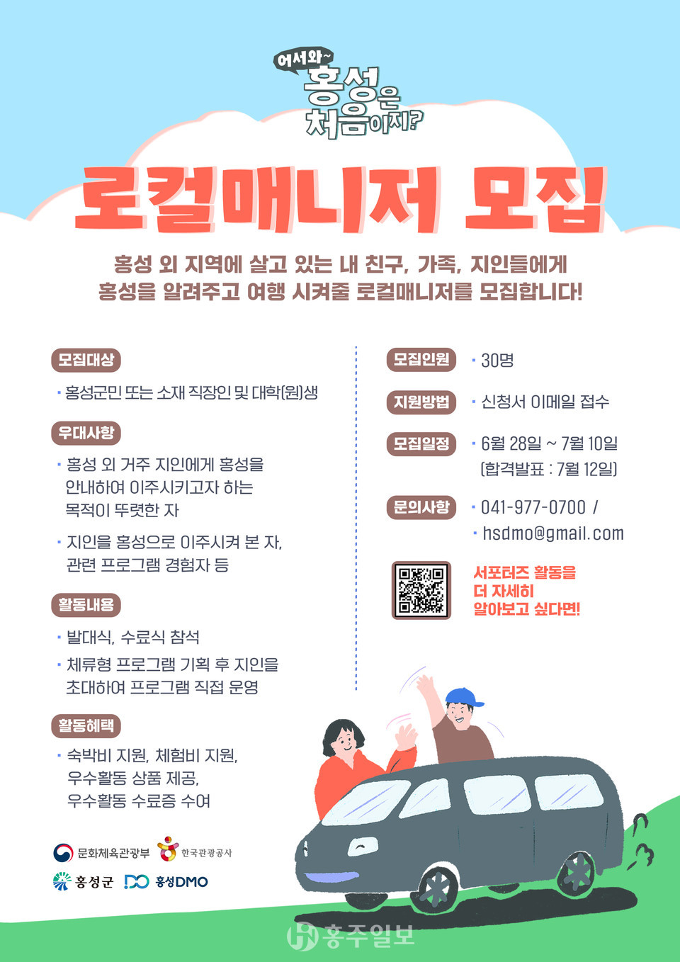 신청은 홍성군청 홈페이지 공지사항 또는 홍성DMO사업단 대표 블로그에서 지원 서식을 다운받아 작성 후 이메일로 제출하면 된다. 로컬매니저는 참가신청서 및 관계 서류심사를 거쳐 최종 선발되며 오는 19일에 진행되는 발대식은 필수 수료기준에 해당된다. 자세한 내용은 홍성DMO사업단 대표 블로그에서 확인할 수 있으며, 문의는 홍성DMO사업단(041-977-0700)으로 하면 된다.