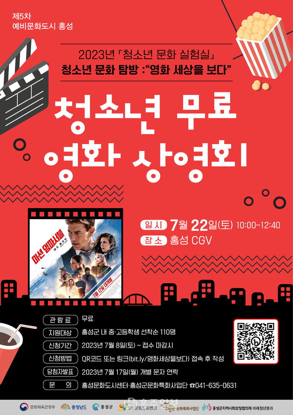 관람료는 무료이며, 지원대상은 홍성군 내 중·고등학생 선착순 110명이고, 신청기간은 오는 8일부터 QR코드 또는 누리집를 통해 접수를 받으며, 영화는 미션임파서블 7을 관람한다.