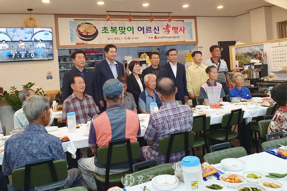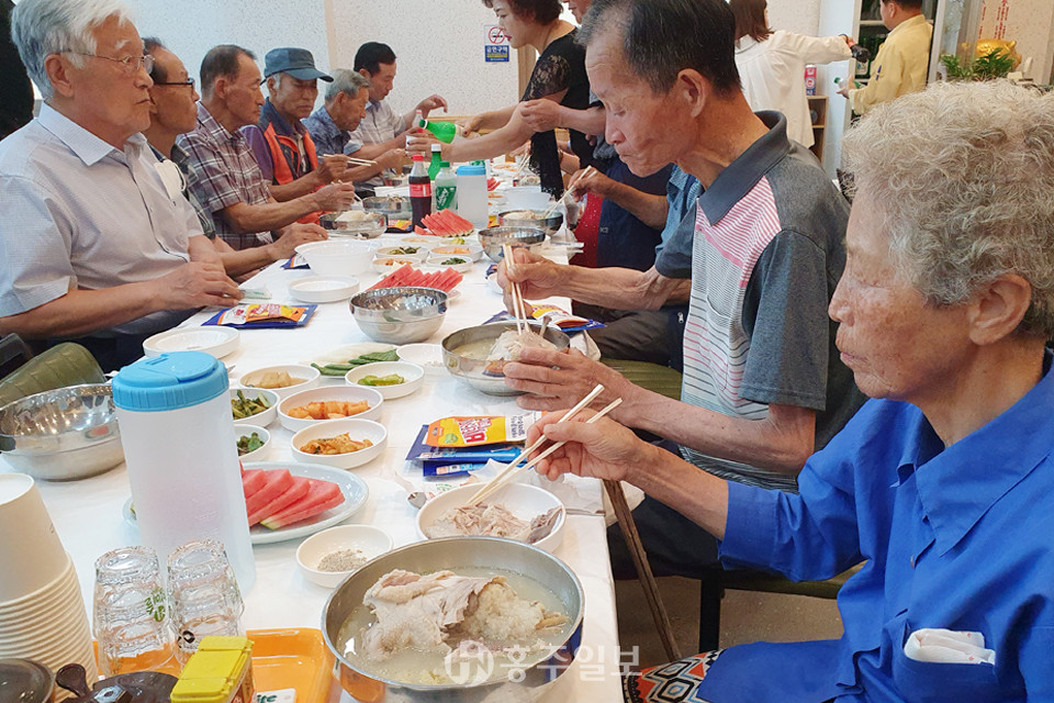 갈산면지역사회보장협의체(민간위원장 정동선·공공위원장 유영길)는 10일 갈산전통시장 소재 한 식당에서 무더위로 고생하시는 지역어르신 30여 명을 모시고 삼계탕으로 초복맞이 행사를 성황리에 개최했다.<사진>