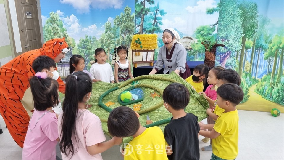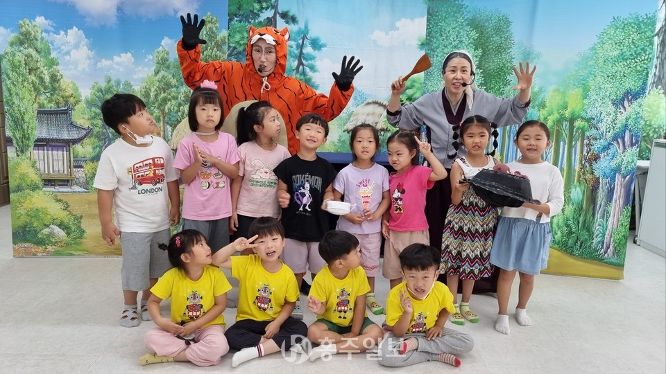 신당초등학교병설유치원(원장 문제민)은 소규모 공동교육과정을 운영하고 있는 갈산초등학교병설유치원 원아들과 함께 지난 10일 어울마당에 모여 ‘팥죽 할머니와 일곱 친구들’이라는 공연을 관람했다.<사진>