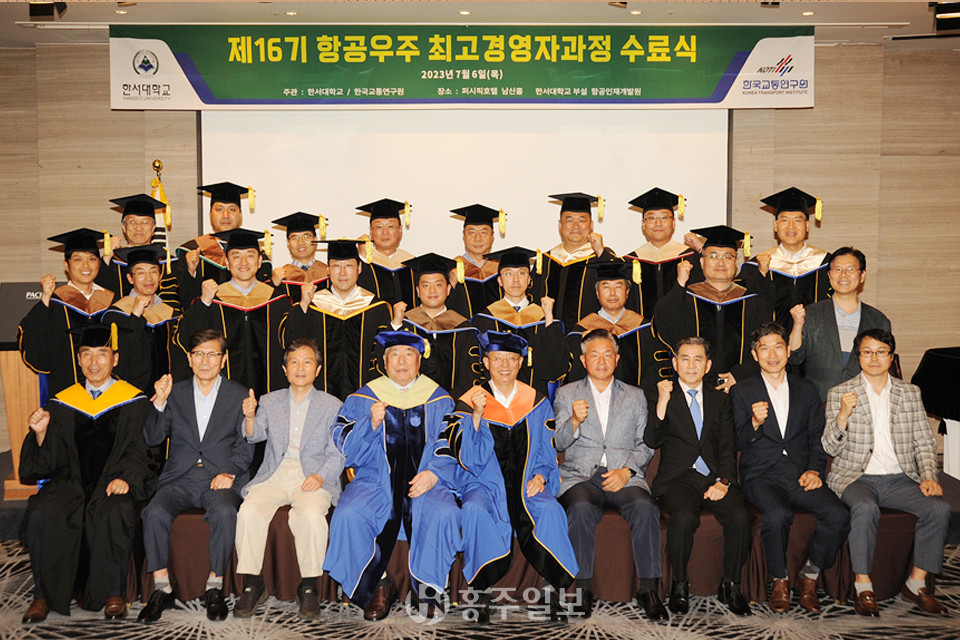 한서대학교(총장 함기선)와 한국교통연구원이 함께 운영하는 항공우주 최고경영자과정(항공우주 AMP) 제16기 수료식이 교육생과 총원우회 회장단 등 60여 명이 참가한 가운데 지난 5일 서울 퍼시픽호텔 남산홀에서 열렸다.
