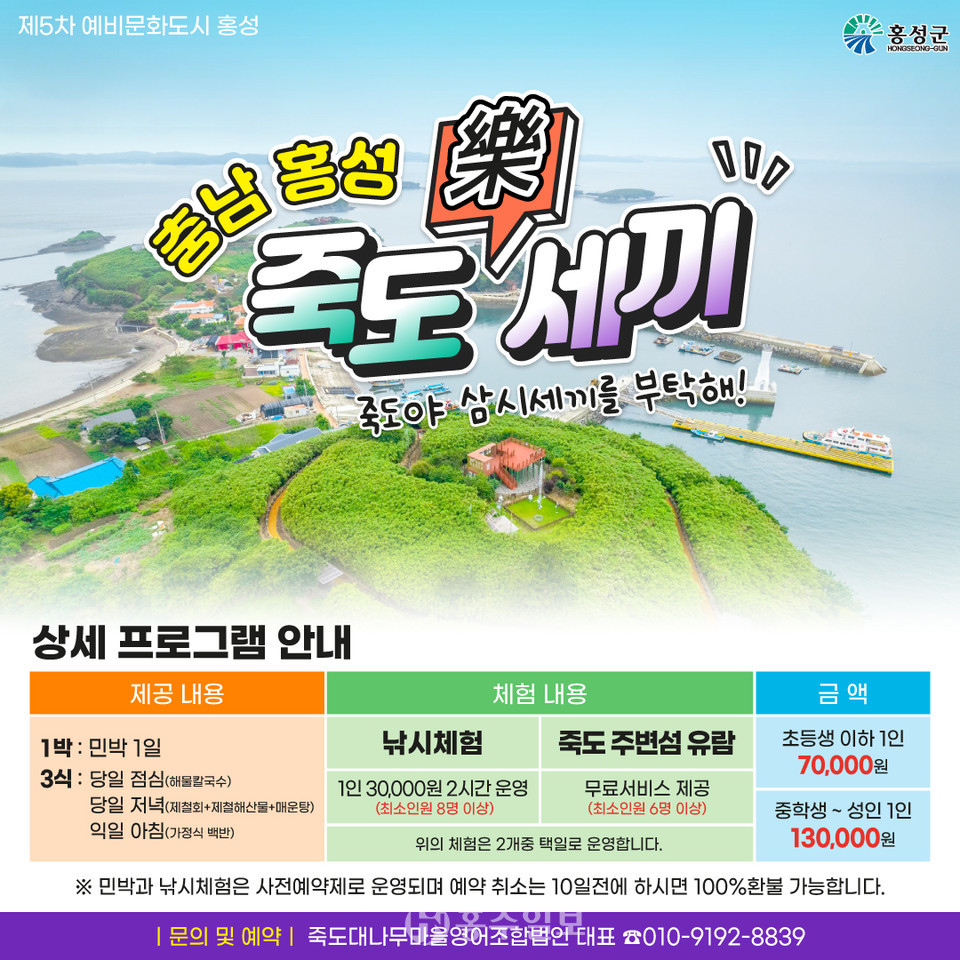 홍성군은 7월 이달의 섬 선정을 기념해 관광객들의 눈과 마음, 입까지 사로잡을 ‘죽도야 삼시세끼를 부탁해!’ 프로그램을 운영한다고 밝혔다.