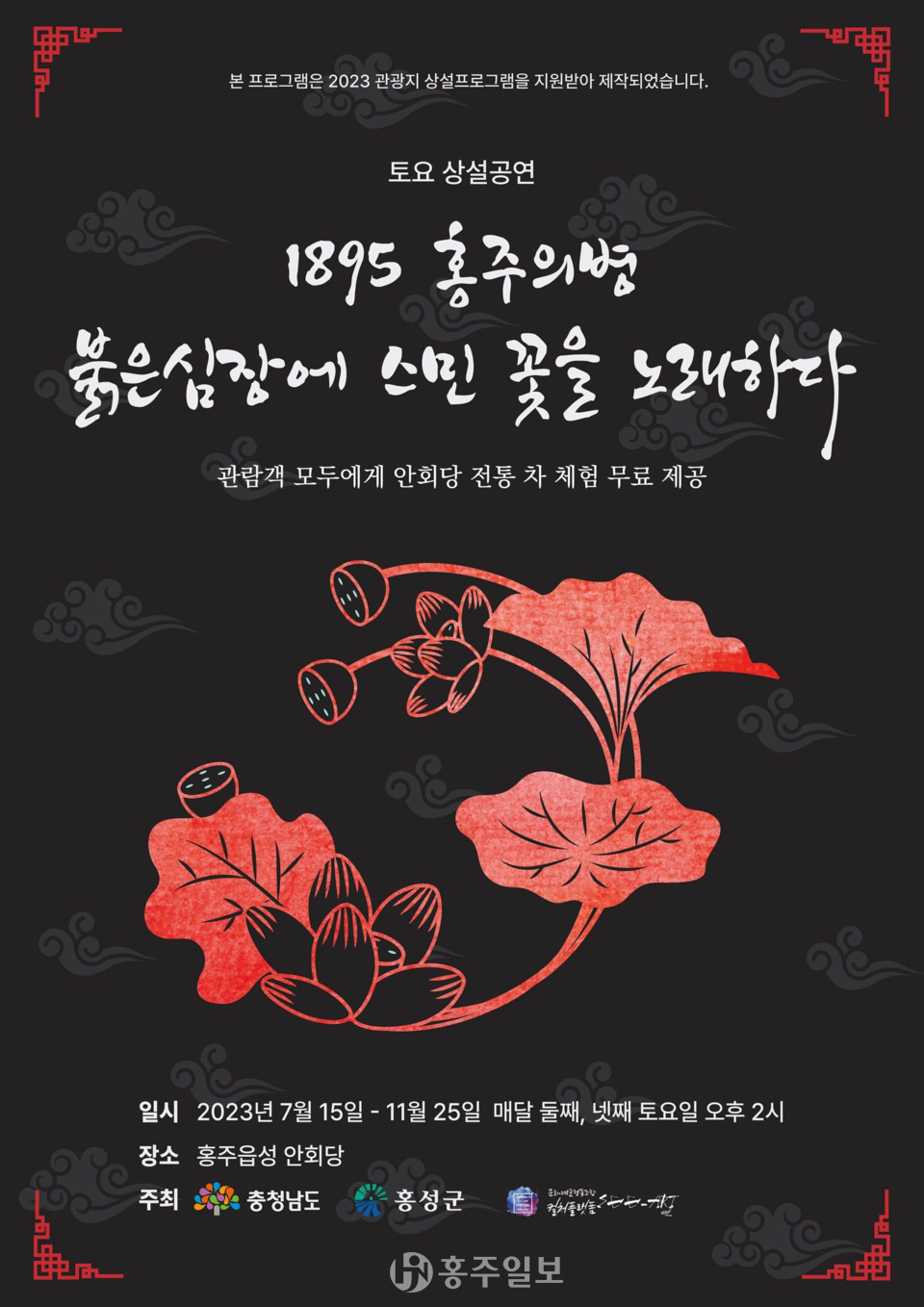 홍성군은 ‘2023년 관광지 상설 프로그램 운영 지원사업’에 선정된 문화재 홍주읍성 안회당을 활용해 7월부터 11월까지 매달 둘째·넷째주 토요일 오후 2시 ‘1895 홍주의병 붉은 심장에 스민 꽃을 노래하다’를 상설공연 한다고 밝혔다.<사진>