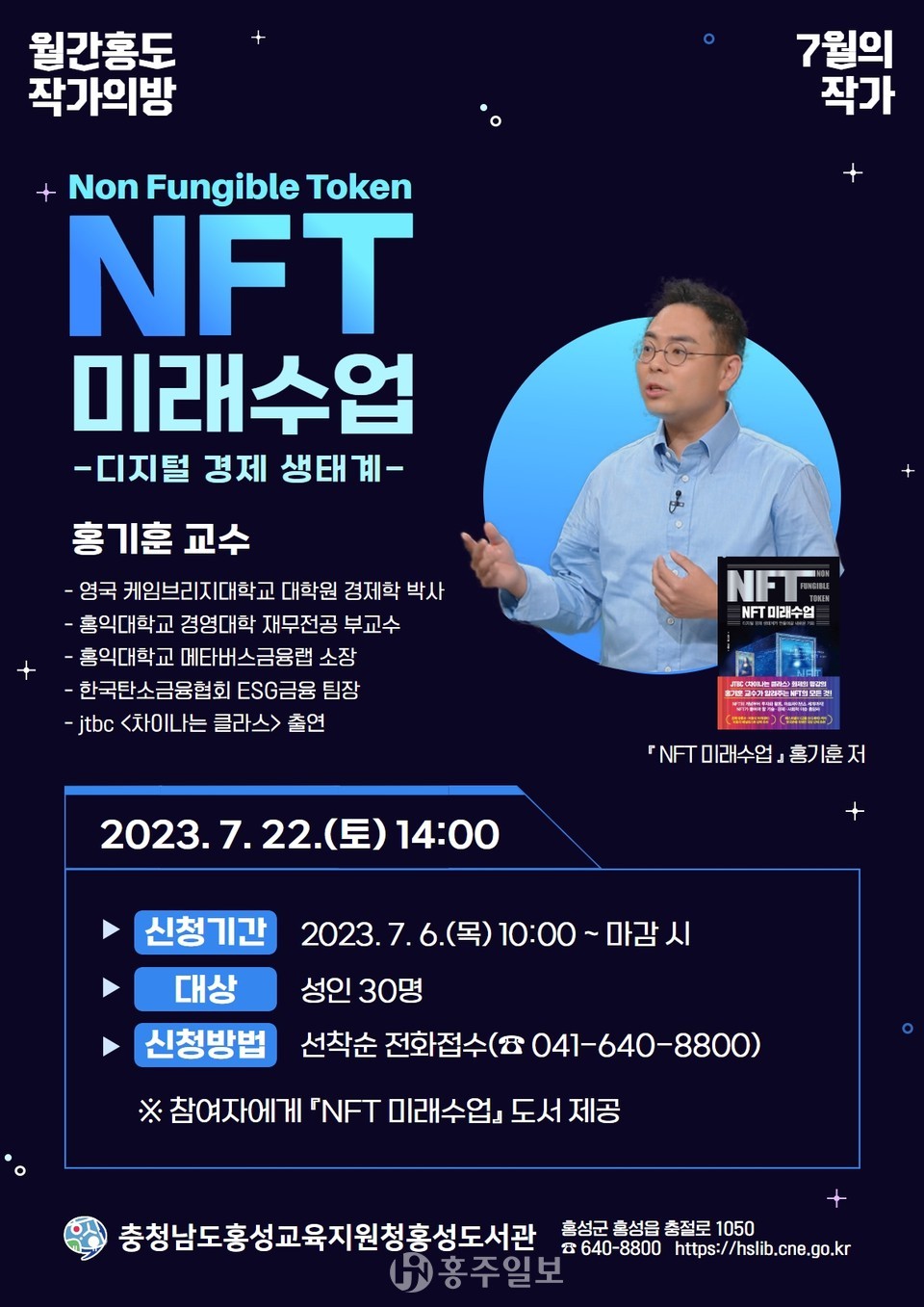 충청남도 홍성교육지원청 홍성도서관(관장 공진숙)은 오는 22일에 ‘월간 홍도 작가의 방’의 7월의 작가인 ‘NFT 미래 수업’ 홍기훈 교수 초청 강연을 운영한다.<사진>