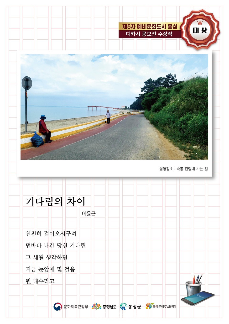 올해 영예의 대상은 경기 군포시에 거주하는 이윤근 씨의 ‘기다림의 차이<사진>’가 차지했으며, 작품은 삶의 깊은 배려를 잔잔한 서해안의 해안선과 둥근 길로 시적으로 절묘하게 표현해 심사위원의 만장일치로 선정됐다.