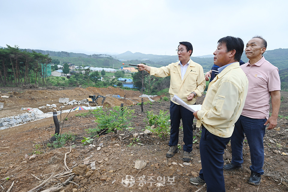 지난 19일 오후 산림청 관계자들이 산불피해 긴급벌채지와 응급복구 사업지 점검을 위해 서부면행정복지센터와 현장을 찾은 가운데 심상택 산림청 산림산업정책국장은 정채환 홍성군 산림과장으로부터 산불피해지 폭우피해 ZERO를 위해 지금까지 진행한 사업내용을 듣고 이 군수에게 감사를 표했다.