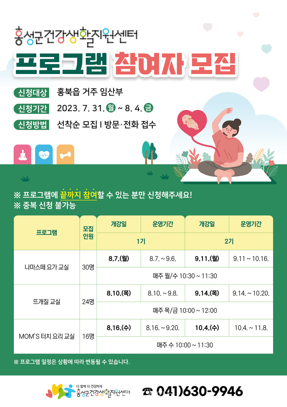 프로그램 일정·참여자 모집 관련 자세한 사항은 건강생활특화팀(041-630-9946)으로 문의하면 된다.