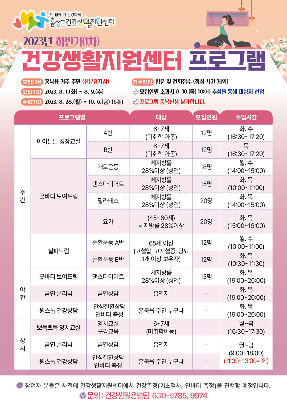 홍성군건강생활지원센터는 8월 1일부터 9일까지 홍북읍 거주 주민을 대상으로 ‘하반기 신체활동 프로그램’ 참여자를 모집한다.