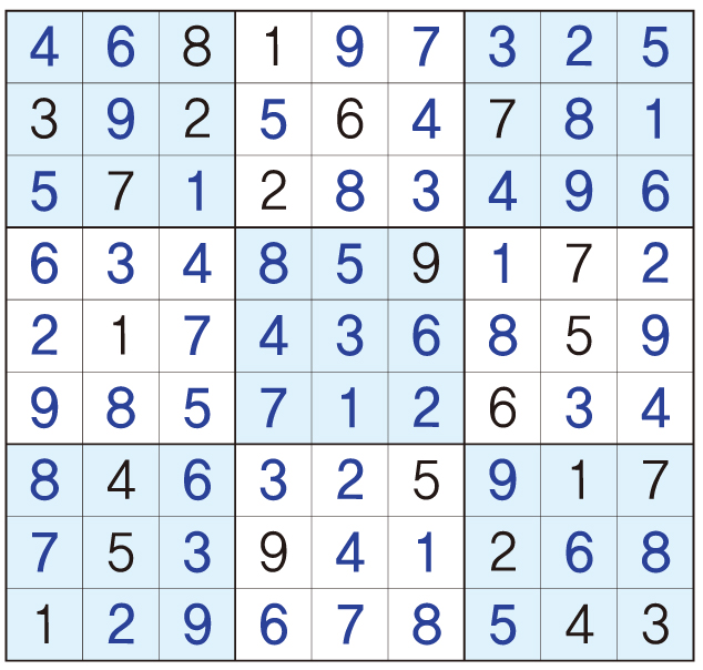 3. 큰 정사각형(9x9) 안에 있는 작은 정사각형(3x3) 안에는 숫자 1~9가 각 한 번씩 들어간다.