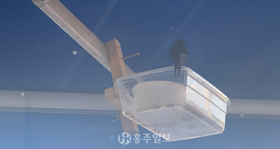 우리 집 양반이 천막 밑에 비가와도 떨어질 염려 없이 어미가 새끼를 돌볼 수 있도록 현대판 제비집을 만들어 주었다.