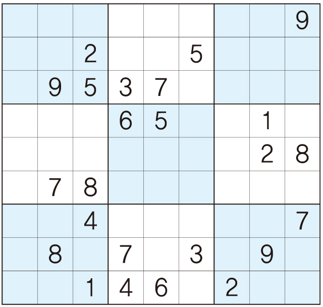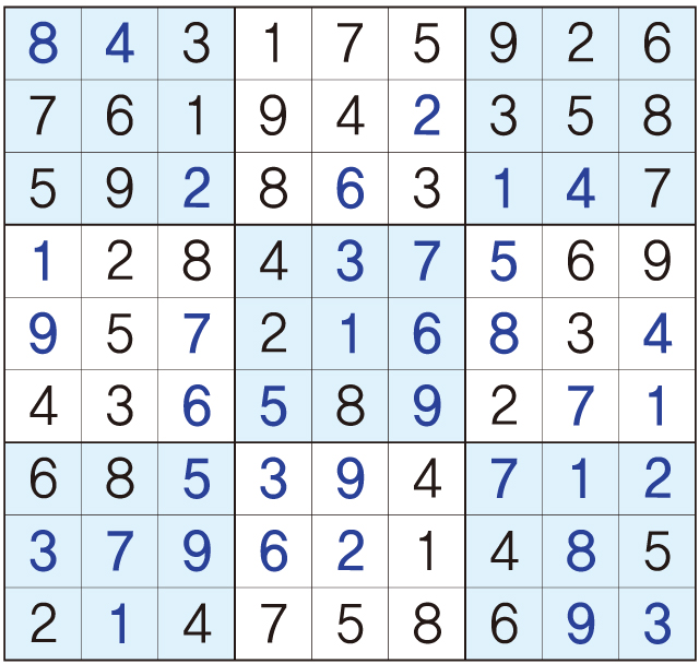 3. 큰 정사각형(9x9) 안에 있는 작은 정사각형(3x3) 안에는 숫자 1~9가 각 한 번씩 들어간다.